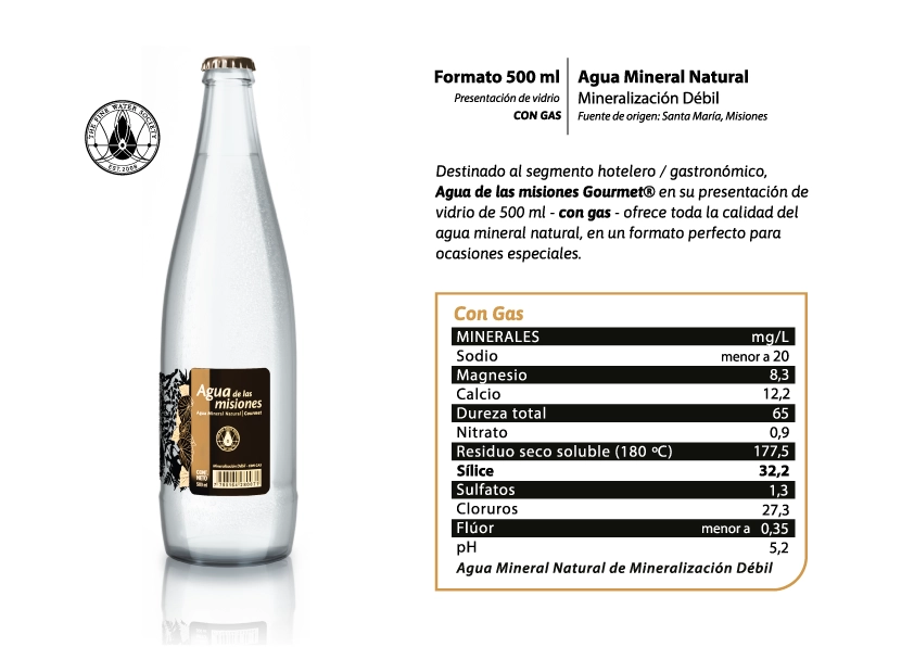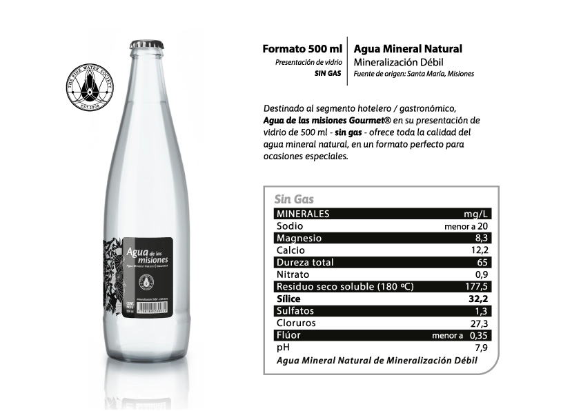Envasada en una planta diseñada especialmente para mantener inalterable su estado original, Agua de las misiones tiene un sabor limpio y neutro debido a su mineralización débil. Cuenta con una excelente protección de la fuente respecto de su entorno, que conserva su virginidad y sus bajos niveles de nitrato.